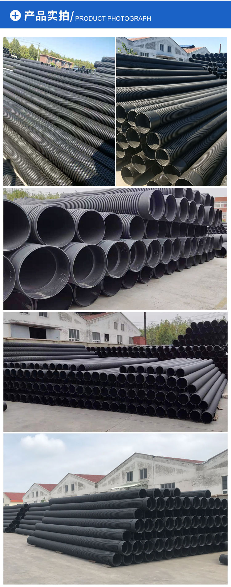 海東環保科技有限公司生產的管材結構特點為內、外雙層壁機構,其中外壁為規則波紋,提高管材抗外壓能力;內壁為平直管壁,保證水流輸送,且承口環向加強筋涉及,抗外壓強度更高。